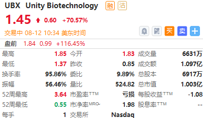 联合生物技术公司Unity Biotechnology盘初涨超70%,Unity Biotechnology宣布单次注射UBX1325可使平均BCVA在12周和18周内得到渐进的、具有统计学意义的、临床意义上的改善。
