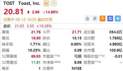 餐饮业支付技术公司Toast $TOST 盘初大涨超14%,二季度度销售额好于预期,公司上调22财年业绩指引。