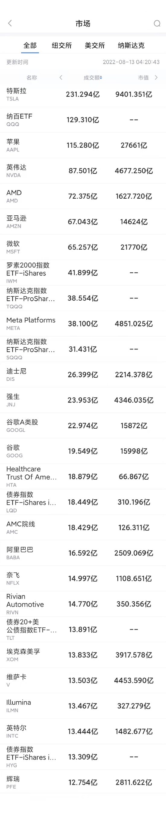 以下为美股当日交易最活跃的20只股票(按成交额):