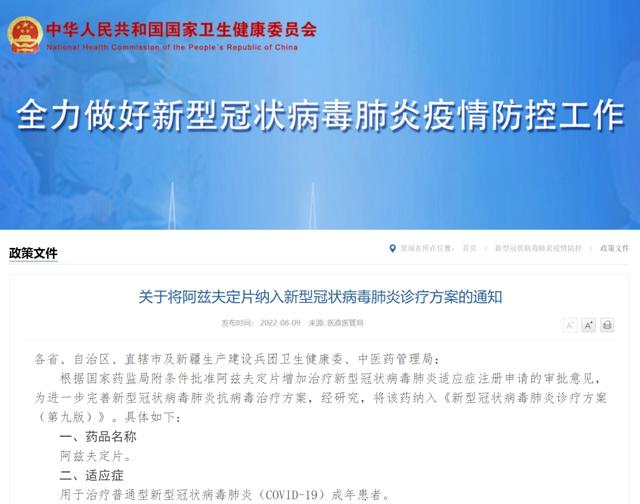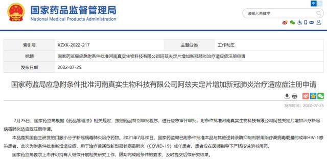 2021年7月20日,国家药监局已附条件批准河南真实生物科技阿兹夫定片与其他逆转录酶抑制剂联用治疗高病毒载量的成年HIV-1感染患者。2022年7月25日,国家药监局应急附条件批准真实生物阿兹夫定片增加新冠肺炎治疗适应症注册申请,用于治疗普通型新型冠状病毒肺炎(COVID-19)成年患者。8月9日,国家卫生健康委办公厅、国家中医药局办公室发布通知称,根据国家药监局附条件批准阿兹夫定片增加治疗新型冠状病毒肺炎适应症注册申请的审批意见,为进一步完善新型冠状病毒肺炎抗病毒治疗方案,经研究,将该药纳入《新型冠状病毒肺炎诊疗方案(第九版)》。根据《诊疗方案》,阿兹夫定片用于治疗普通型新型冠状病毒肺炎(COVID-19)成年患者。在用法用量为空腹整片吞服,每次5mg,每日1次,疗程至多不超过14天。