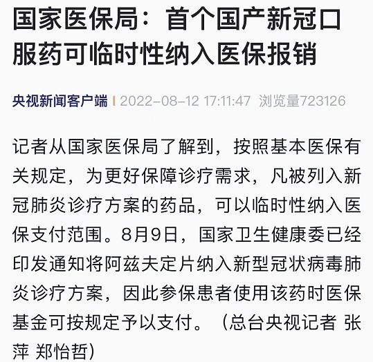 据国家医保局,按照基本医保有关规定,为更好保障诊疗需求,凡被列入新冠肺炎诊疗方案的药品,可以临时性纳入医保支付范围。8月9日,国家卫生健康委已经印发通知将阿兹夫定片纳入新型冠状病毒肺炎诊疗方案,因此参保患者使用该药时医保基金可按规定予以支付。