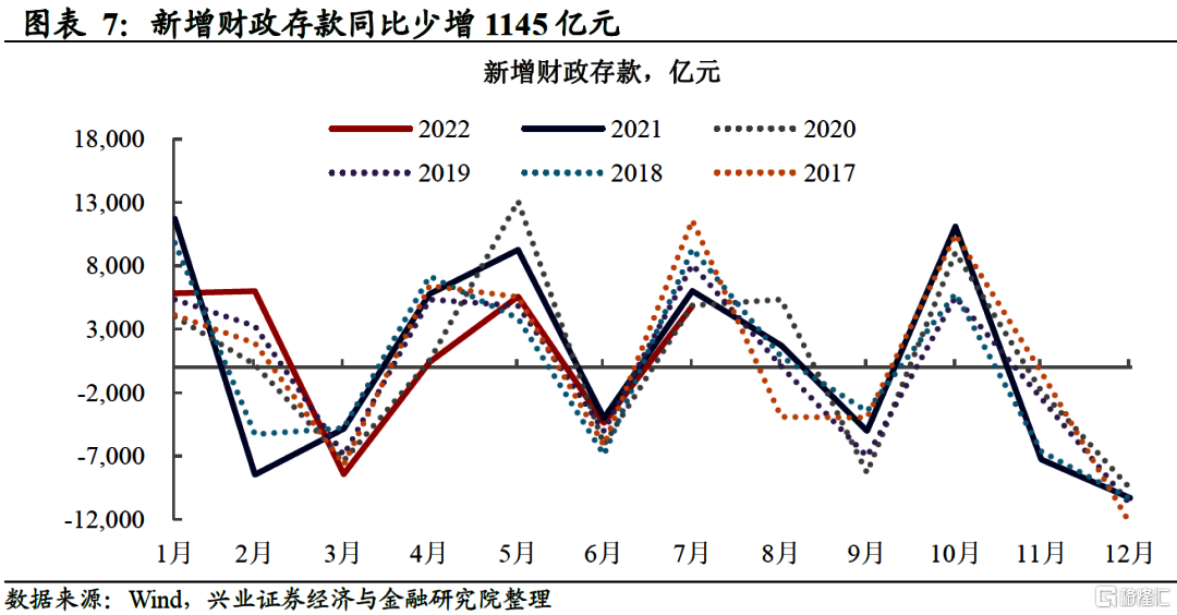 政府债券融资规模仍高于2021年水平,财政发力仍在继续。2022年7月,新增政府债券融资规模3998亿元,同比多增2178亿元。2022年上半年在“稳增长”背景,政策要求上半年专项债发行完毕,2022年5-6月专项债进入放量赶进度阶段;2022年7月在经历一波赶进度后,政府债券融资环比虽下滑,但同比仍处于多增状态;同时7月新增财政存款同比少增1145亿元,指向财政支出端也在持续发力。