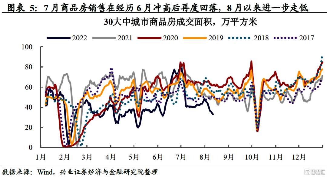 居民融资走弱主要是受购房需求拖累。今年以来,居民新增贷款持续弱于往年,主要来自于中长期贷款的拖累。居民短期贷款与消费相关,虽然2022年4月受疫情扰动居民短贷出现“砸坑”,但6月经历补缺口,7月有所走弱,但与2021年水平差异不大。居民中长期贷款与购房需求相关,从房地产销售数据看,2021年下半年以来,商品房销售持续处于较弱状态,尤其是2022年3月以来,叠加疫情冲击额外影响,房地产销售大幅弱于往年,虽然2022年6月经历冲高,但更像是前期受疫情影响而出现的需求缺口的回补,2022年7月商品房销售再度回落,尤其是2022年8月以来出现进一步下滑,拖累2022年7月居民中长贷走弱。