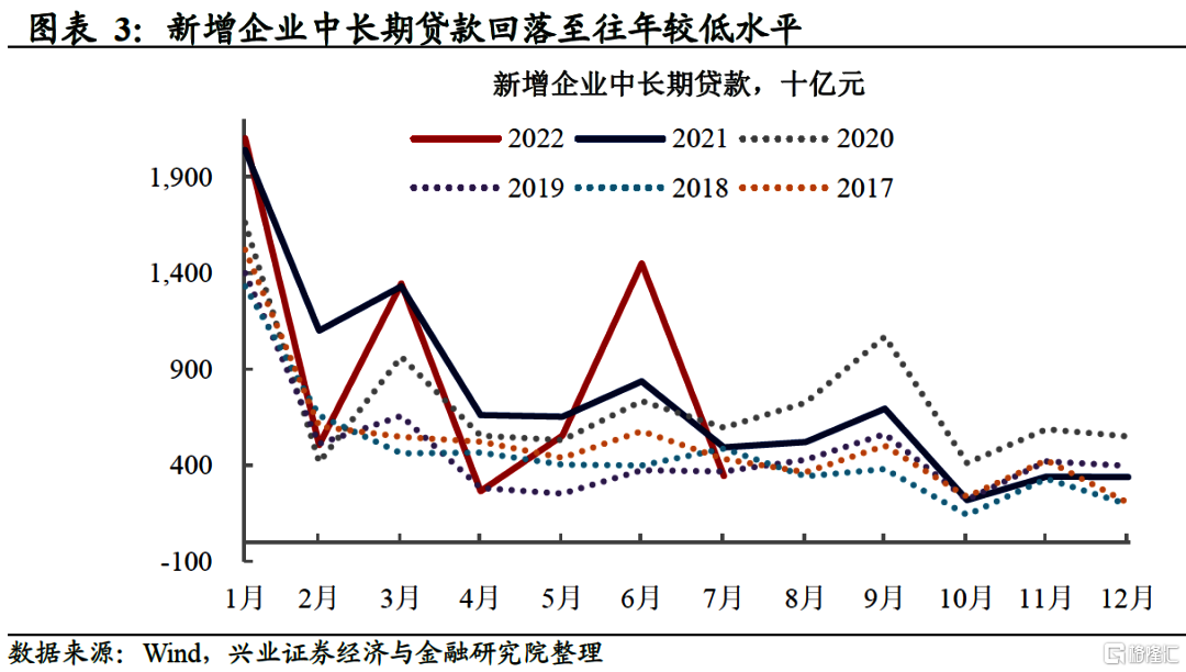 企业融资走弱有前期信贷透支影响,也有疫情再现干扰的压力。2020年3月,信贷支持上一轮疫后经济恢复发力最大时期,企业新增贷款规模同比多增8721亿元,之后2020年4月企业新增贷款经历大幅回落。2022年6月,本轮信贷疫后经济恢复发力最大时期,企业新增贷款同比增加达到9945亿元(其中短期贷款同比多增3815亿元、长期贷款同比多增6130亿元),比上一轮力度还要大。2022年7月,企业新增贷款回落,有前期经济“爬坑冲高”过程中信贷有所透支的影响;但本轮企业融资在冲高回落中,幅度较上一轮更大,一方面可能是因为本轮信贷发力幅度更大、透支更大,回落也相对更大,一方面也有2022年7月以来疫情又有反复,企业生产、预期本就羸弱又再受扰动,额外拖累企业融资需求;票据融资的再次冲高,同比多增1365亿元,也反映企业融资需求不足。