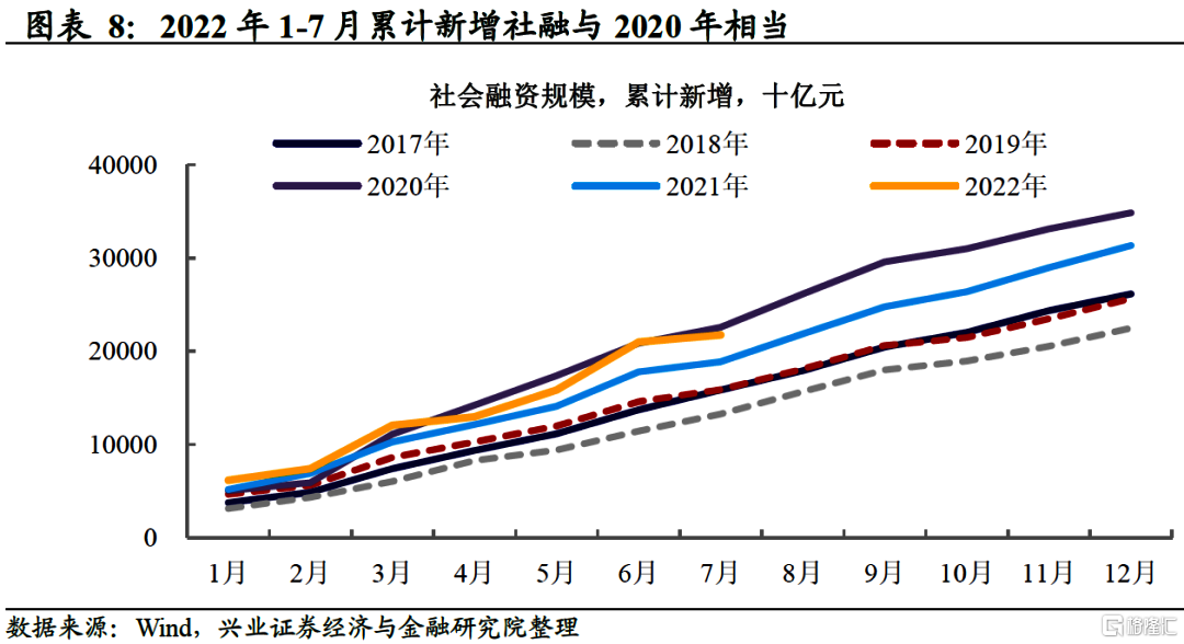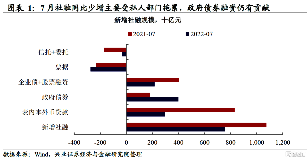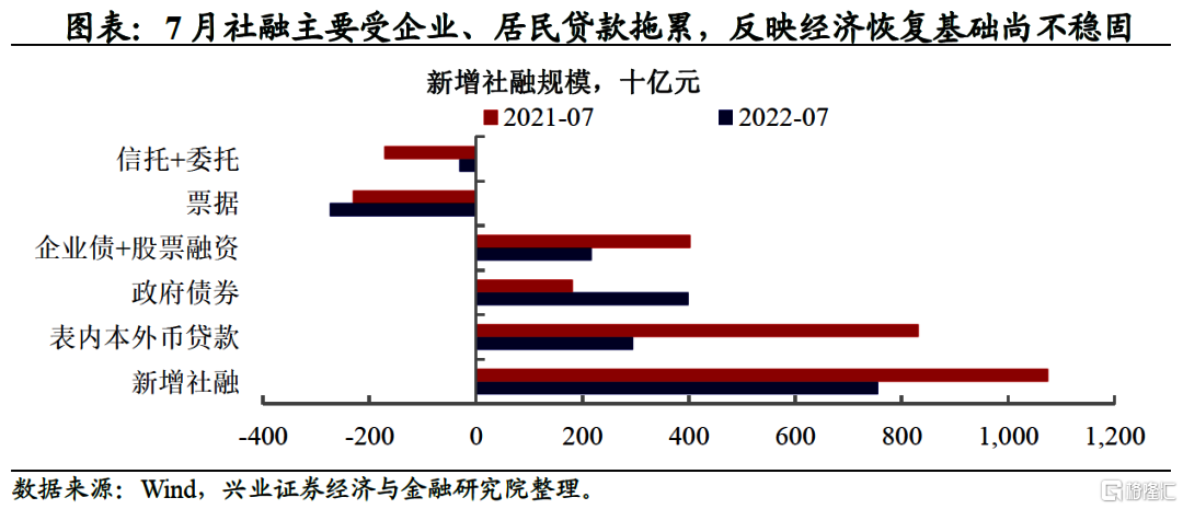 社融数据低于预期反映私人部门修复仍需要时间。2022年5月以来,经济处于“疫后反弹+政策呵护”阶段,政策发力稳增长叠加疫后补缺口,反映为6月新增社融大超预期。然而我们在中期报告(详见20220627,《东边日出西边雨——2022年中国宏观中期报告》)中特别提醒,虽然疫情冲击最严重时期已经过去、经济进入修复期,但私人部门信心恢复仍需要时间。2022年货币政策执行报告也研判,国内经济恢复基础尚需稳固,消费恢复面临挑战,扩大投资存在难点堵点,这些实际上都预示着7月社融低于预期。