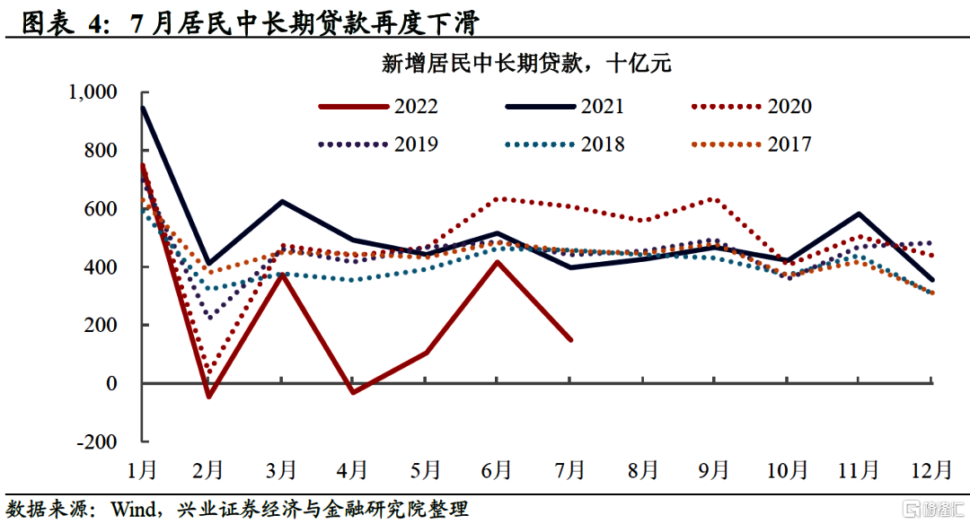 居民端:中长期贷款下滑拖累居民融资需求再度走低。7月,居民新增贷款1217亿元,同比少增2842亿元,其中中长期贷款少增2488亿元,是居民贷款少增的主要拖累,短期贷款少增354亿。