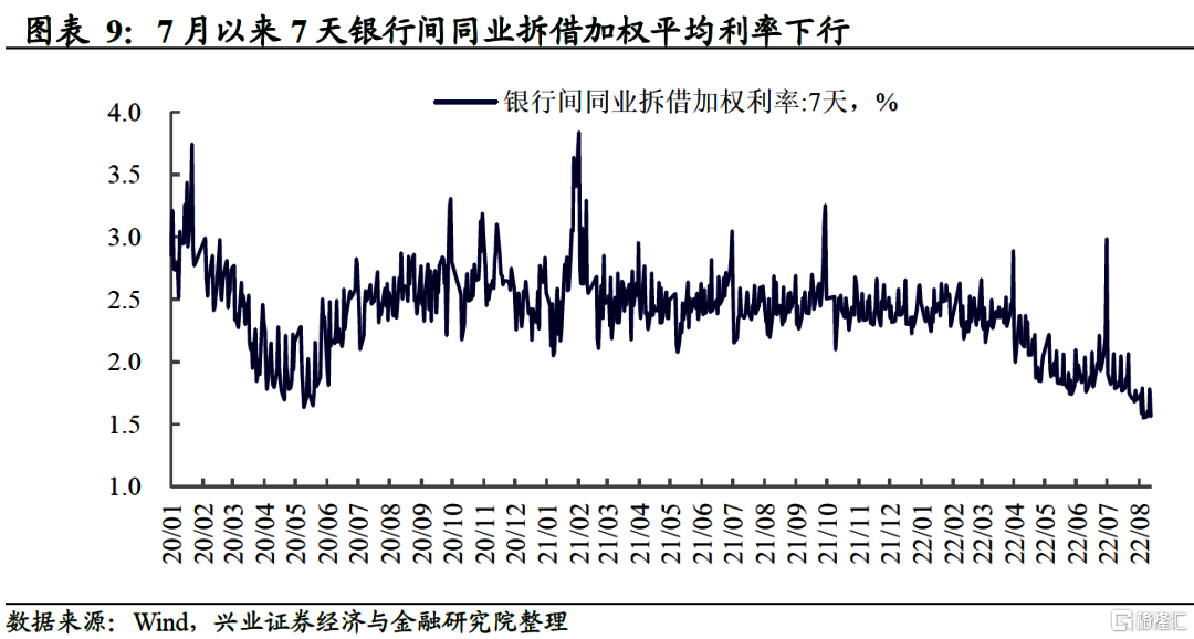 累计新增社融不弱,M2保持高增,银行间利率下行,流动性环境仍较宽松。2022年7月,新增社融在同比层面虽然少增,但2022年1-7月累计新增社融规模达21.76万亿,与2020年同期22.56万亿的规模相当;而从企业贷款角度看,2022年1-7月新增企业贷款规模已达到9.2万亿,比2020年、2021年同期水平都要高,这或许也是影响今年以来M2处于较高增速的原因。2022年7月,M2同比上涨12%,高于前值11.4%,继续走高,但与信贷走弱有所背离,或主要受7月新增人民币存款同比多增1.18万亿、以及财政存款同比少增影响,对冲了社融下行对M2增速的不利影响。此外,7月新增社融虽现较大波动,短期宽信用虽不及预期,但7天银行间同业拆借加权平均利率7月以来仍在下行,反映流动性环境仍较宽松。