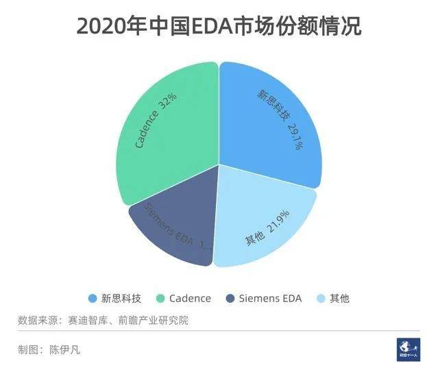 根据第三方数据分析机构前瞻产业研究院统计,全球EDA市场有大约80%被新思科技、Cadence和Mentor Graphics三家国外公司占领。其中,新思科技和Cadence总部在美国。中国也是这三家EDA公司的主要市场。根据第三方研究机构赛迪智库的统计,2020年,中国的EDA市场中,Cadence的市场份额为32%,其次为新思科技,为29.1%,Siemens EDA排名第三,为16.6%。