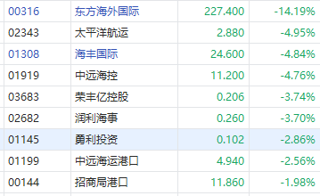 华盛资讯8月15日消息,海运股全线重挫,截至发稿,东方海外国际(00316)大跌14.19%,太平洋航运、海丰国际、中远海控跌超4%。
