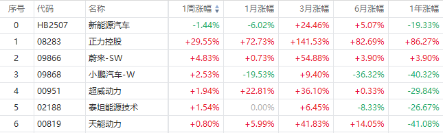 国内新能源造车新势力在港股市场涨跌互现,蔚来汽车近一周涨4.83%,小鹏涨2.53%, 理想汽车近一周跌5.38%。比亚迪近一周走弱累跌1.92%。