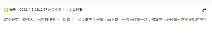 对于该回复,业主似乎并不是很买账。有业主直言“新房就漏水,这单是修复的问题吗”,也有业主提出诉求“外墙、内墙、顶部等防水重做,重做的工序和材料要公开,修复完成后要有第三方机构出具的检验合格证明。”