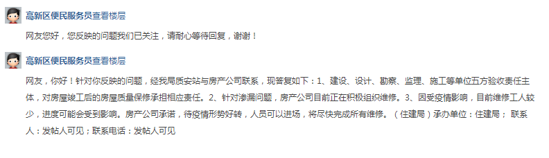 对此,高新区住建局当时与房产公司联系后答复称“1、建设、设计、勘察、监理、施工等单位五方验收责任主体,对房屋竣工后的房屋质量保修承担相应责任。2、针对渗漏问题,房产公司目前正在积极组织维修。3、因受疫情影响,目前维修工人较少,进度可能会受到影响。房产公司承诺,待疫情形势好转,人员可以进场,将尽快完成所有维修。”