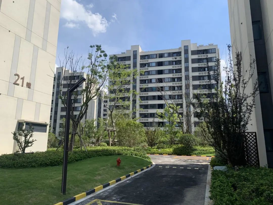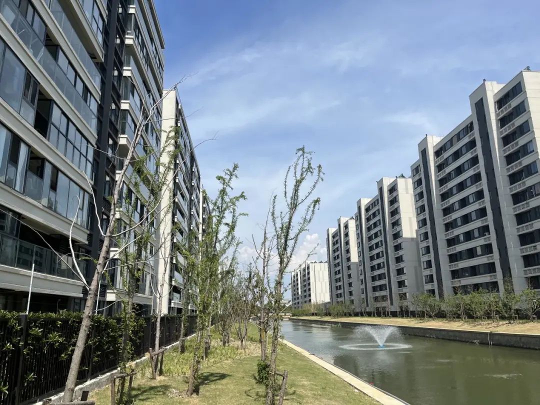 从现场走访来看,小区共规划了22栋8-11F小高层住宅,共计852户,分为南北两区,中间由一条小河隔开,在区域属于比较低密的住宅小区。小区建筑设计为现代风格,楼幢外立面为米白色与黑深灰色真石漆墙面搭配大面积玻璃栏板,整体看起来比较简洁、大气。