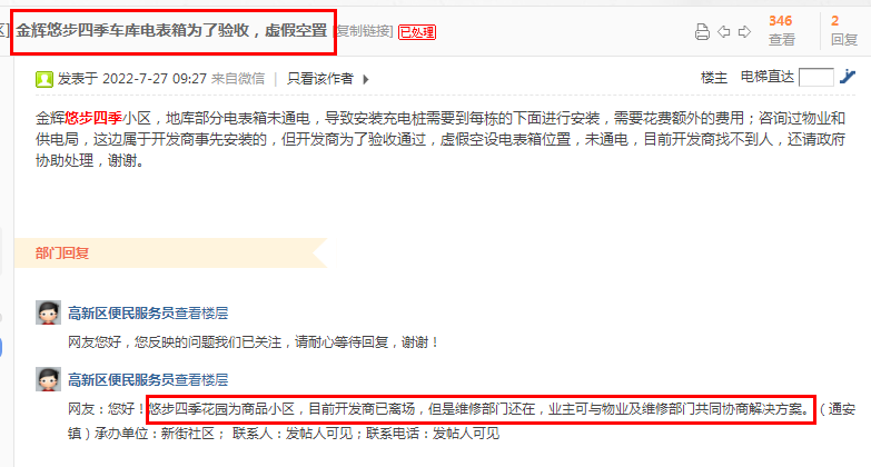 能看出关于该项目的交付验收还是有不少漏洞出现的,投诉也并未结束。就在7月底,又有业主投诉称“金辉悠步四季开发商为了验收车库电表箱,虚假空置,导致业主需花费额外费用,且目前业主找不到开发商的人来解决该问题。”对此,高新区便民服务员回复称“目前开发商已经离场,但维修部门还在,业主可与物业及维修部分共同协商解决方案。”从官方回复中,能发现该问题确实存在,且是不合规的。
