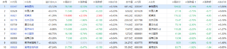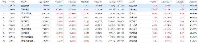 截至A股收盘,AH股涨幅前10如下:
