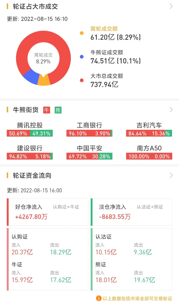 其中,窝轮总成交额为61.2亿港元,牛熊证总成交额为74.51亿港元。