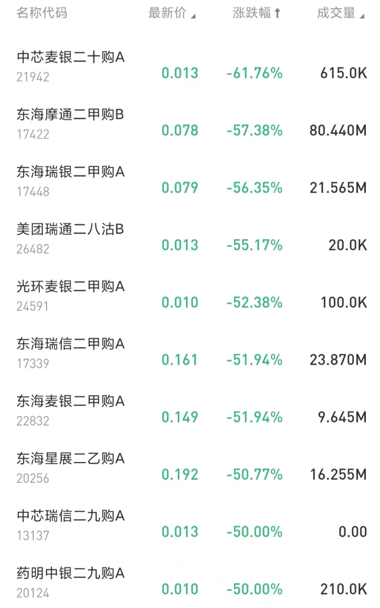 在今日跌幅榜中,中芯麦银二十购A $21942.HK 跌61.76%;东海摩通二甲购B $17422.HK 跌57.38%。