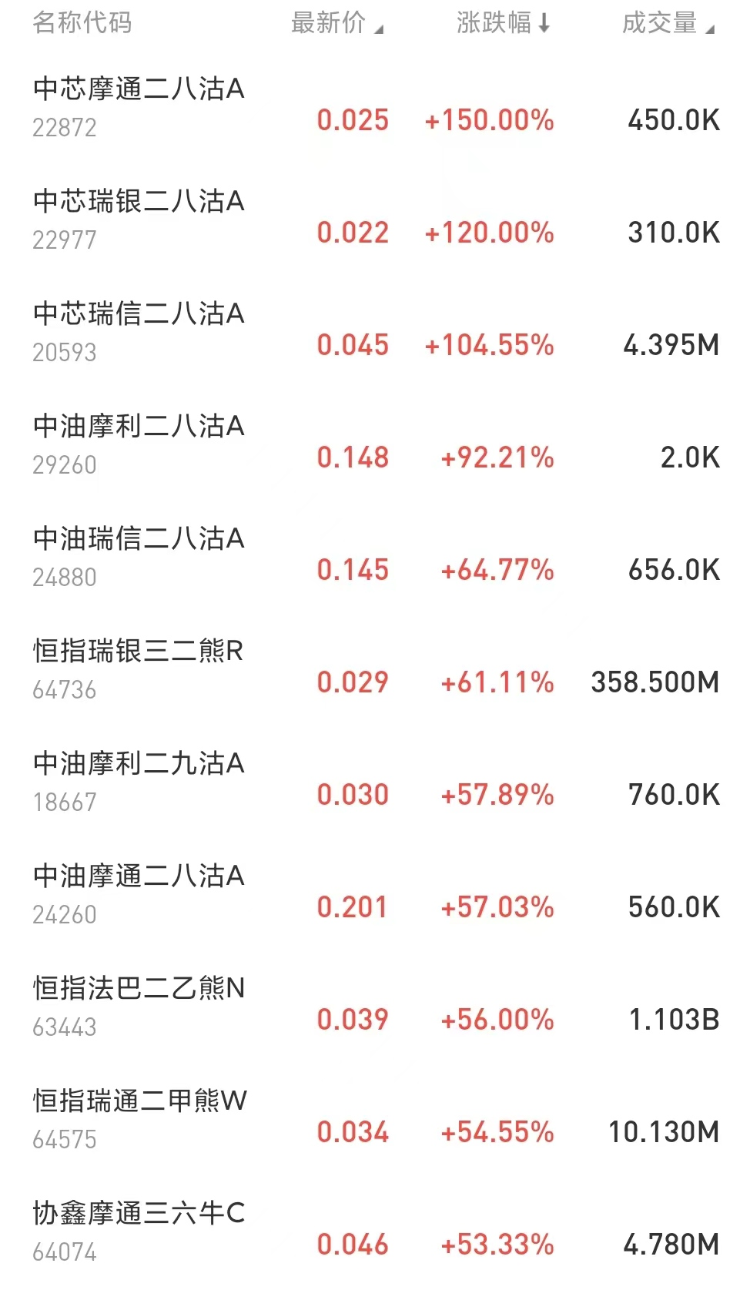 在今日涨幅榜中,中芯摩通二八沽A $22872.HK 涨150%;中油摩利二八沽A $29260.HK 涨92.21%,恒指瑞银二三熊R $64736.HK 涨61.11%。