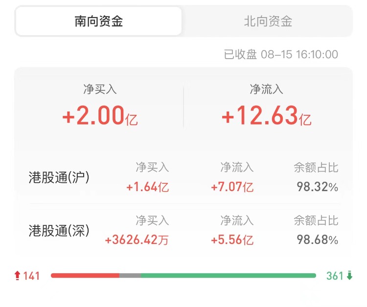 南下资金今日净买入港股2亿港元,其中港股通(沪)净买入1.64亿港元,港股通(深)净买入3624.42万港元。上一交易日净买入港股9.9亿港元。