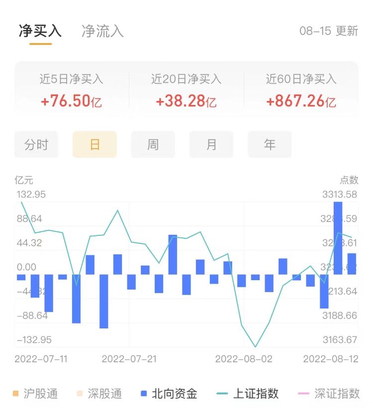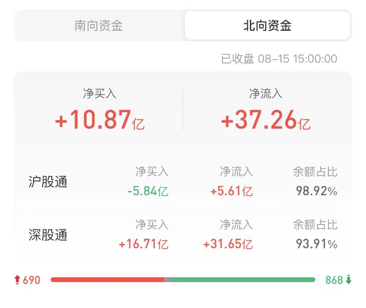 北上资金今日净买入10.87亿元,沪股通净卖出5.84亿元,深股通净买入16.71亿元。上一交易日净买入38.78亿元。