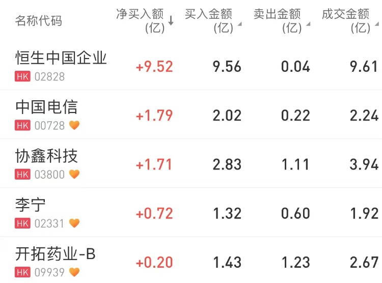 南下资金净买入恒生中国企业9.52亿港元,为今日买入之最。此外,南下资金净买入中国电信1.79亿港元,净买入协鑫科技 $03800.HK 1.71亿港元。