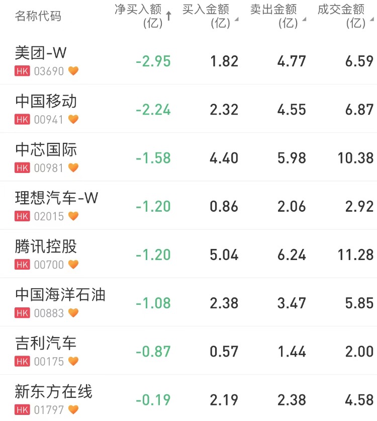 南下资金净卖出美团-W2.95亿港元,为今日卖出之最,净卖出中国移动2.24亿港元。