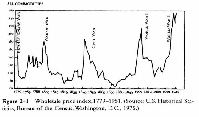 为了将长期趋势转变为观点,看看下图。这张图描绘了大宗商品价格将近两百年的历史走势。这幅图带给我的第一个冲击是它涵盖的时间真的很长。它不是CRB大宗商品价格指数的每日更新,后者告诉你的消息是美国中部是否在下雨。这幅图包含了衰退期和复苏期、剧烈的上涨和崩溃、通货膨胀和通货紧缩。看看二战期间大宗商品价格的上涨多么猛烈啊。