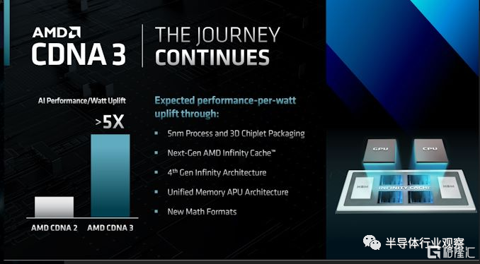 除此之外,决定GPU计算性能的关键指标是存储访问带宽和延迟。在这个方面,增加DRAM带宽,使用HBM等最新的内存接口已经是GPU的标准配置,相信未来随着DRAM接口标准的演进,GPU也会优先使用最新的DRAM接口。而除了DRAM之外,高速缓存(cache)也是关键的存储,缓存容量会大大影响计算的延迟和功耗。Nvidia和AMD都在积极地扩大高速缓存的容量,而在这方面AMD使用新技术的步伐则领先Nvidia——目前Nvidia在H100增加缓存主要还是考虑2D的方式即在同芯片上加大缓存面积,而根据AMD今年六月份公布的最新CDNA3 GPU架构,CDNA3会使用高级封装技术,使用单独的缓存芯片粒(chiplet),并且将缓存芯片粒和GPU使用堆叠的方式集成在一起(即Infinity Cache)。这样一来,高速缓存芯片粒的存储容量就有可能大大增加,从而提升性能。