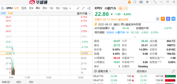 华盛资讯8月15日消息,热门中概股多数下挫,每日优鲜、小鹏汽车跌超6%,报22.86美元。