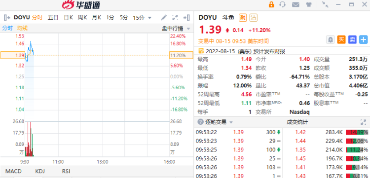 其他中概股方面,斗鱼涨11%,报1.39美元。此前公司发布财报,Q2净利润2350万元,毛利率增长至16.9%。