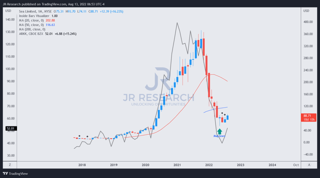 我们观察到,SE 可能在 5 月进入长期底部,因为它在过去三个月中建立了建设性基础。请注意,鉴于 SE 无利可图,我们对 SE 采取更为保守的立场。