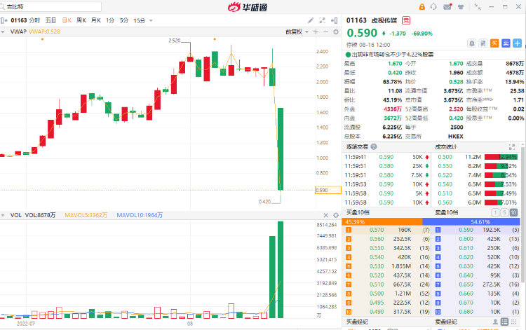 华盛资讯8月16日消息,今日虎视传媒闪崩,早盘一度暴跌超74%至0.42港元,市值仅剩2.6亿港元。该股此前自6月15日的0.7港元一路上涨至8月1日的2.52港元,期间最大累计涨幅达260%。公司午间公告称,下午一时起短暂停止买卖。截至午间收盘,虎视传媒下跌69.9%。