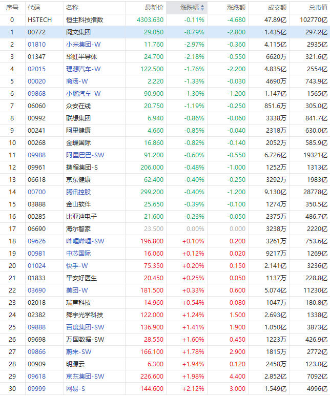 盘面上,阅文集团绩后挫8.79%,现报29.05港元每股;造车新势力方面,理想汽车-W跌1.76%,小鹏汽车-W跌1.3%,蔚来-SW涨1.78%。