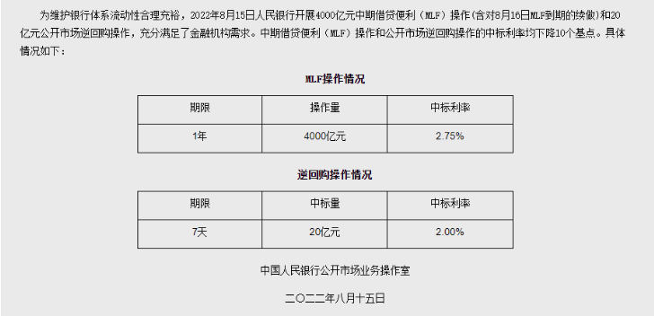 建行研报指出,由于7月社融信贷增速超预期疲弱,本次MLF操作利率下调10BPs,为后续各期限的LPR下调打下基础,本月1年和5年期以上LPR有望同步下调,将进一步降低实体经济融资成本,刺激企业和居民部门的内生性融资需求。