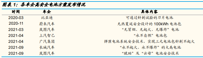电动车安全事故对品牌损伤严重,影响终端市场份额,这倒逼车企重视电池安全。经过几年发展,动力电池在电芯、电解液、热管理系统等多方有了巨大的升级,各大车企也纷纷推出了自身高安全电池解决方案,例如比亚迪刀片电池、广汽弹匣电池等。
