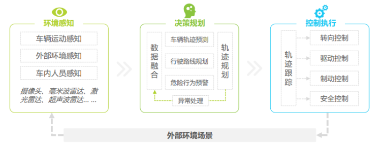 解决智能驾驶的三个核心问题即我在哪儿、我去哪儿、我该如何达到,至少需要三个架构:环境感知、决策规划、控制执行。