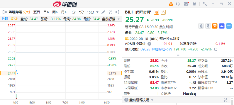 华盛资讯8月16日消息,美股盘前,腾讯系中概股美股盘前普跌,拼多多(PDD)、哔哩哔哩(BILI)跌超3%,京东(JD)跌近3%。