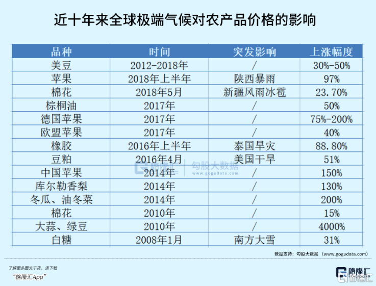 据统计,大多数情况下,过去十年来极端天气对全球各种农产品价格的影响幅度都超过50%,一些小的品种涨幅甚至能超过1倍。