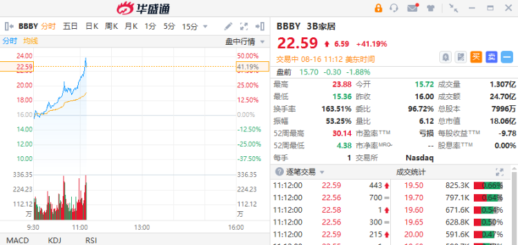 华盛资讯8月16日消息,美股盘中,WSB概念股走势分化,截至发稿,3B家居涨超41%,报22.66美元,成交额24.7亿美元。值得关注的是,该股3日累涨超110%。