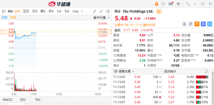 Nu Holdings涨超17%,报5.48美元。Nu Holdings在第二季度增加了570万客户,使用其服务的个人和企业数量达到6530万。