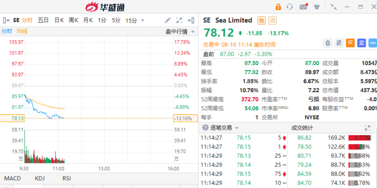 “东南亚小腾讯”Sea跌超13%,报78.12美元。公司Q2营收29.43亿美元,同比增长29%;净亏损9.31亿美元,上年同期净亏损4.34亿美元;每股亏损1.03美元。