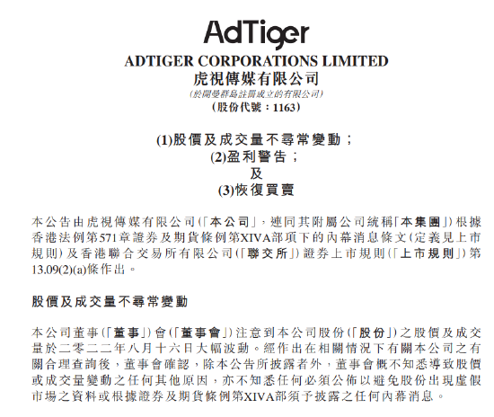 公司董事会注意到公司股份的股价及成交量于2022年8月16日大幅波动。经作出在相关情况下有关公司的有关合理查询后,董事会确认,除本公告所披露者外,董事会概不知悉导致股价或成交量变动的任何其他原因,亦不知悉任何必须公布以避免股份出现虚假市场的资料或根据证券及期货条例第XIVA部须予披露的任何内幕消息。