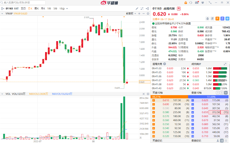 华盛资讯8月17日消息,港股虎视传媒一度涨超10%,于今日复牌,现涨5.08%,报0.62港元每股;昨日停牌前跌近70%,虎视传媒公告称,预期上半年纯利同比减少约52%–56%,概不知悉导致股价或成交量变动的任何其他原因。
