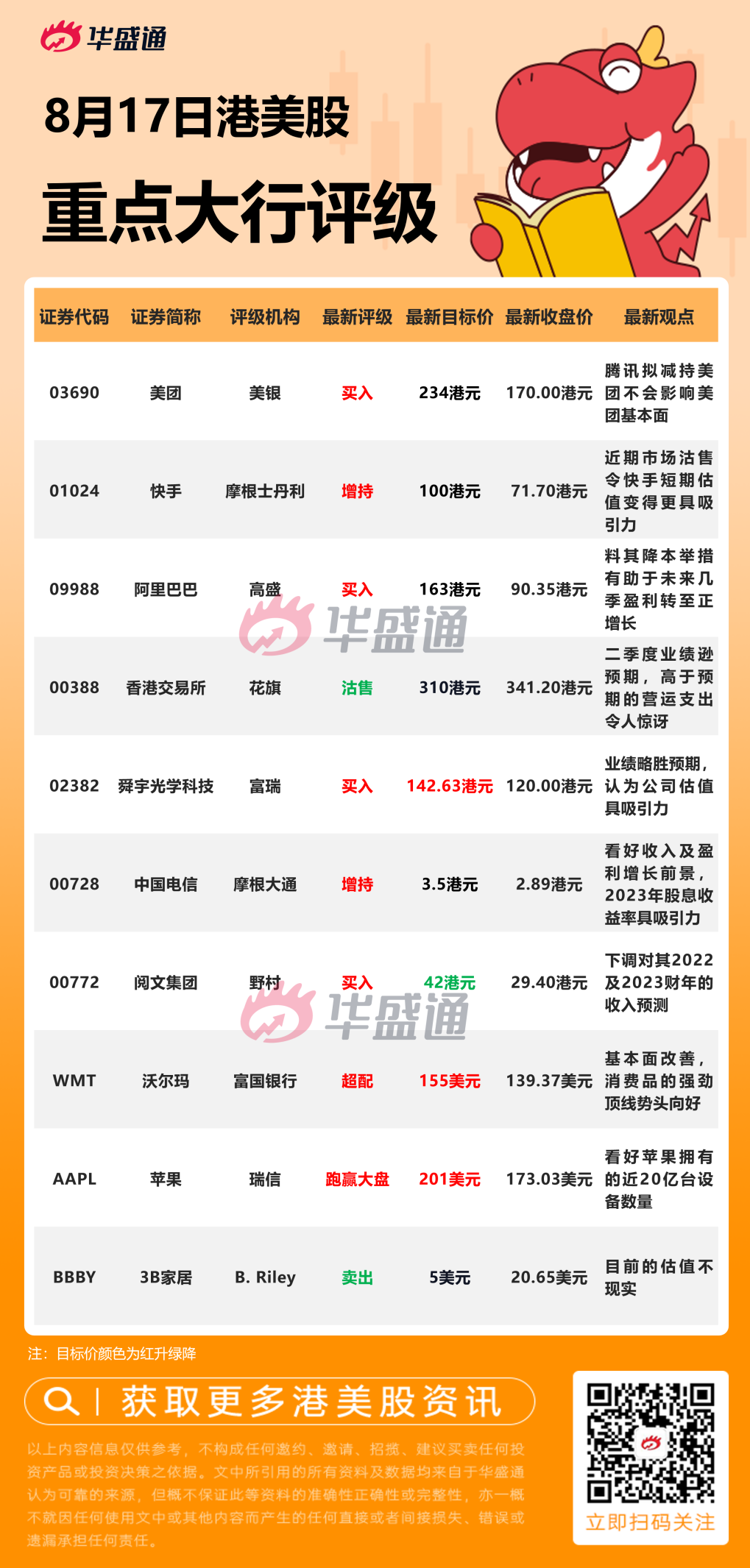 摩根士丹利发表研报,预期快手的股价在未来60日内有超过80%机率会跑赢大市,因近期市场沽售令快手短期估值变得更具吸引力,给予增持评级。快手将于8月23日公布第二季业绩,摩根士丹利指出,斗鱼 $DOYU 及腾讯音乐 $TME Q2业绩都展现强大的成本控制能力,预期快手亦有潜力实现行业内利润率最大增长幅度,又认为快手的闭环生态系统及强劲流量增长推动下,下半年增长将更强劲,目标价100港元。