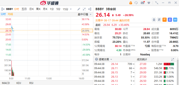 华盛资讯8月17日消息,美股盘初,WSB概念股多数上扬,截至发稿,3B家居 $BBBY 延续强势,现涨近30%,报26.14美元,成交额16.41亿美元。