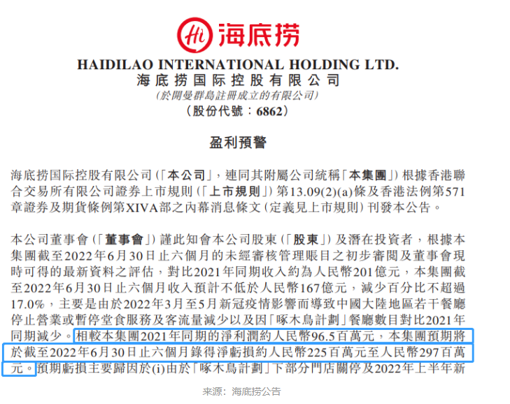 8月14日,海底捞(6862.HK)披露业绩预报,预计上半年净亏损2.25亿元-2.97亿元。预亏主因是外在的疫情影响以及内在的“啄木鸟计划”,双重作用下导致客流量下降。