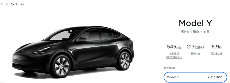 据特斯拉中国官网显示,特斯拉Model Y 后轮驱动版交付时间已缩短为4-8周,此前交付时间为8-12周。