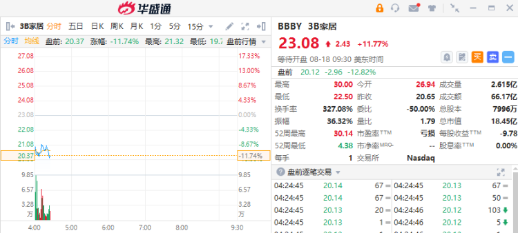 华盛资讯8月18日消息,美股盘前,被散户连日爆炒的3B家居盘前跌12.58%,消息面上,该公司第二大股东科恩(Ryan Cohen)周二提交的文件显示,他可能会抛售其所持有的全部3B家居股票和一些看涨期权。