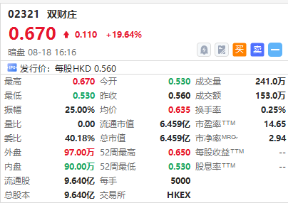 华盛资讯8月18日讯,食品饮料分销商双财庄 $02321.HK 暗盘现涨19.64%,一手账面浮盈约500港元,最新总市值超6亿港元。该股预计将于明日(8.19)正式港股挂牌上市。