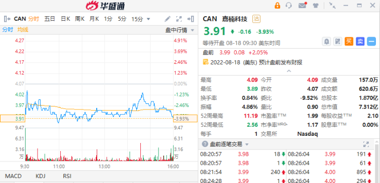 嘉楠科技公布2022年第二季度财务报告。报告显示,嘉楠科技在本季度录得营收16.5亿元人民币,同比增长52.8%,环比增长21.9%。截至北京时间20:28,嘉楠科技盘前涨超2%。